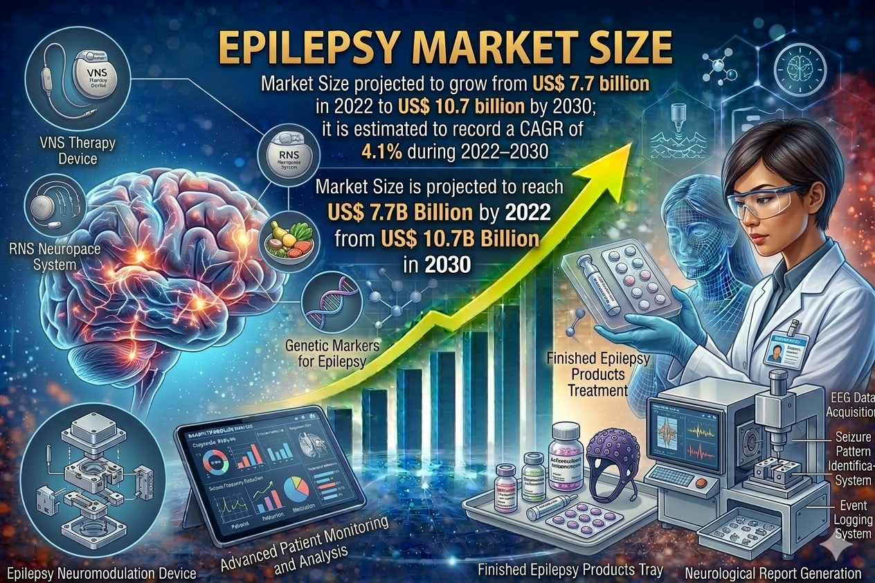 The epilepsy market is expanding steadily as the prevalence of neurological disorders continues to rise worldwide. The market is projected to grow from US$ 7.7 billion in 2022 to US$ 10.7 billion by 2030, registering a CAGR of 4.1% during 2022–2030. Growing demand for advanced therapies and improved healthcare access are contributing to the overall market expansion.